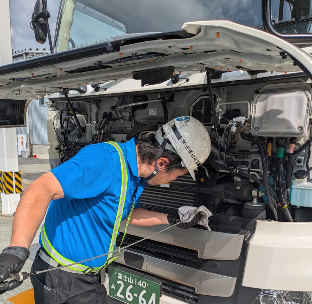 出庫前・帰庫後のチェックと整備対応お客様の大切なお荷物を安全にお運びするため、日々、車両の点検・整備を行っています。