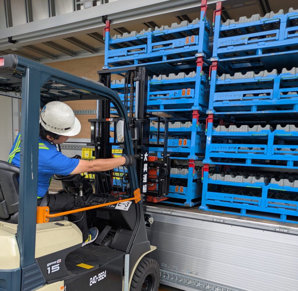 現場での積み込み作業は、安全確認を徹底して行います。隣接確認・周囲確認・低速走行など、基本動作を守りながら事故防止に努めています。